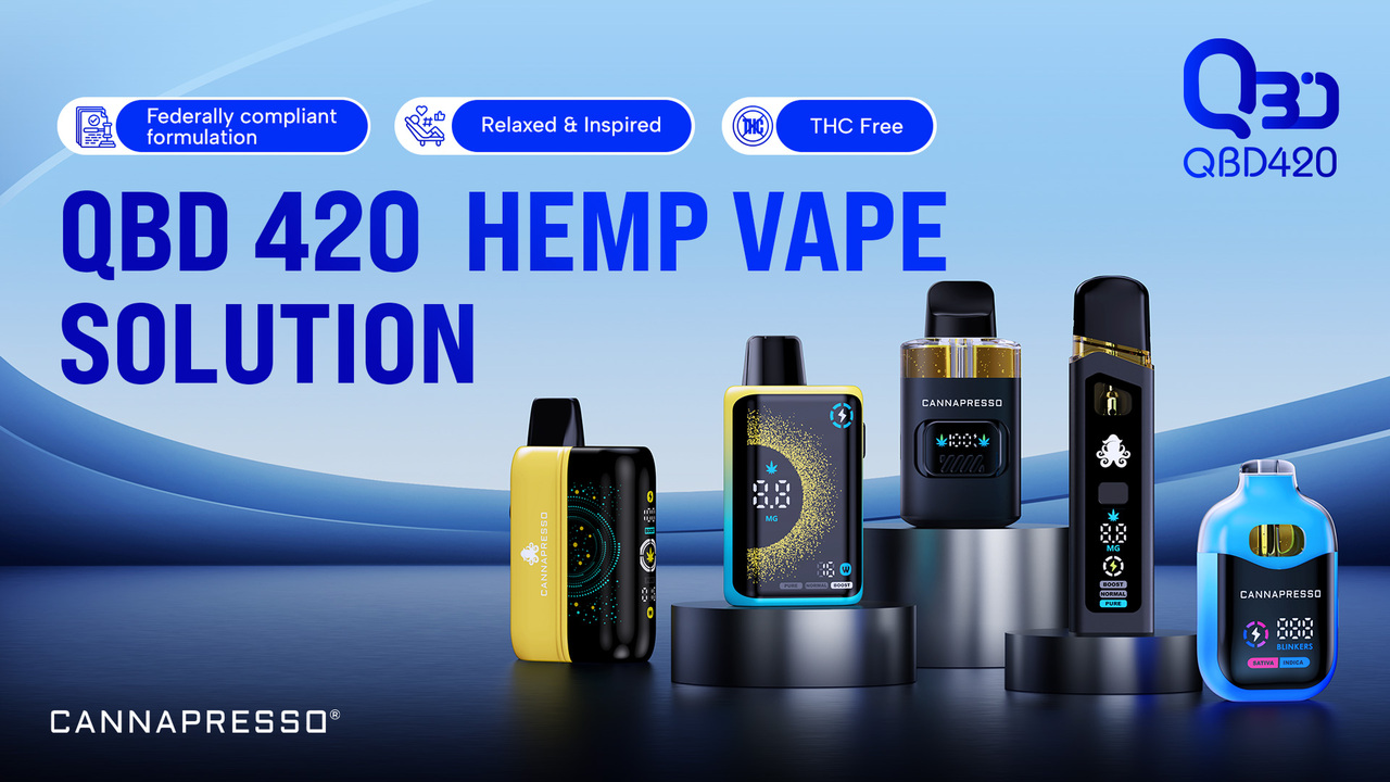 QBD420™ is Cannapresso’s signature cannabinoid blend, built with compliant cannabinoids like CBD, CBN, and CBG to unlock richer flavor, smoother draws, and a more enjoyable uplift. It’s designed to turn every puff into a premium, crave-worthy experience. It is a safe, effective, and federally compliant multi-cannabinoid formula that combines five major hemp-derived components:
